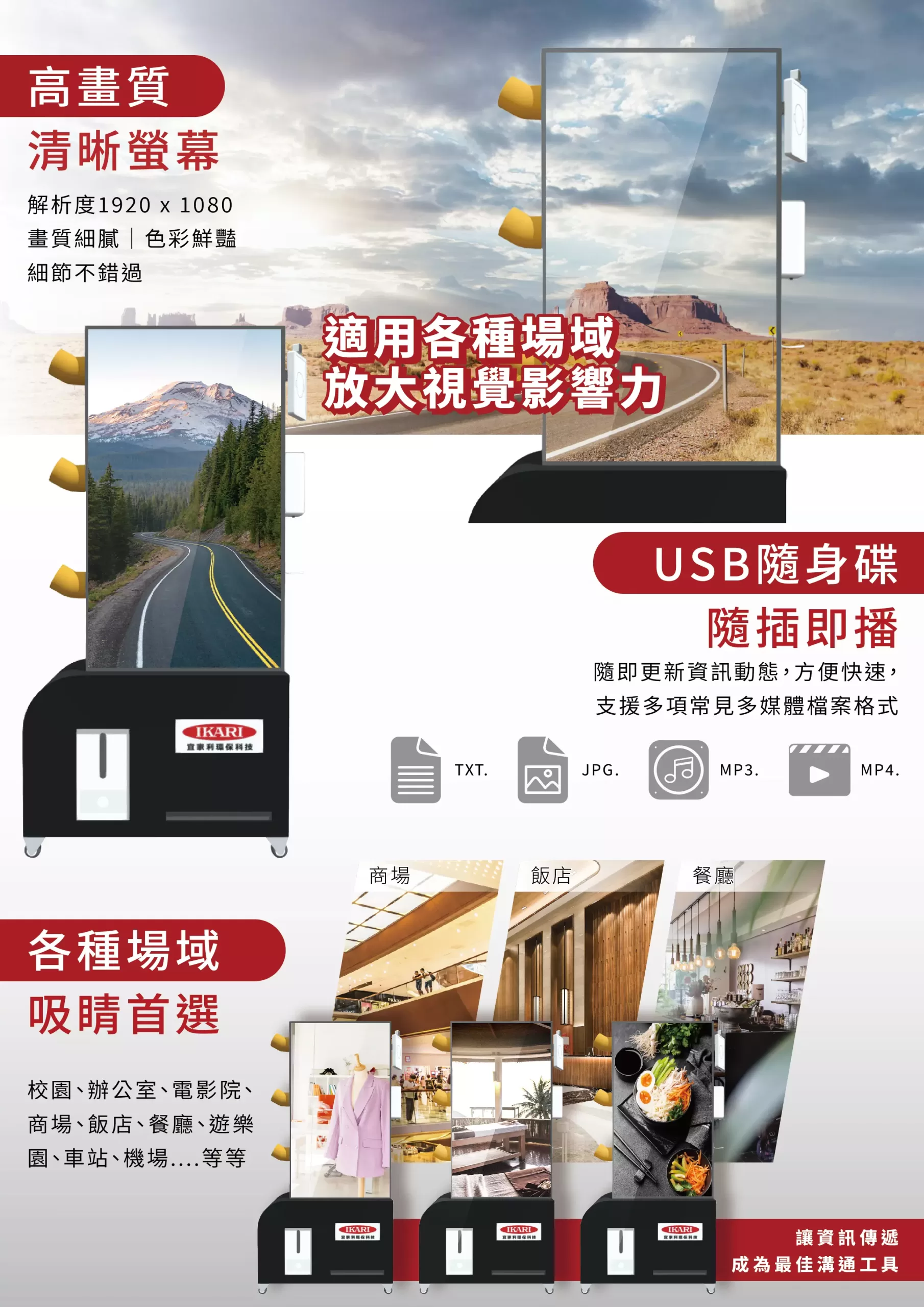 數位廣告輪播:這款防疫設備具備廣告行銷功能,能置放廣告海報及輪播行銷影片。例如,設於餐廳門口可撥放餐點照片,吸引顧客消費,大幅提高產品曝光與購買意願!