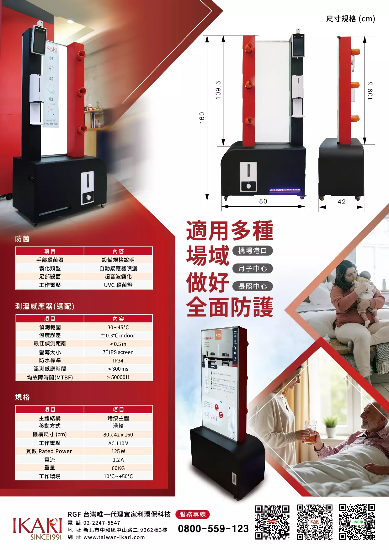 - 【防疫功能】設於出入口:自動量測額溫與霧化抗菌液,高效阻絕病毒。